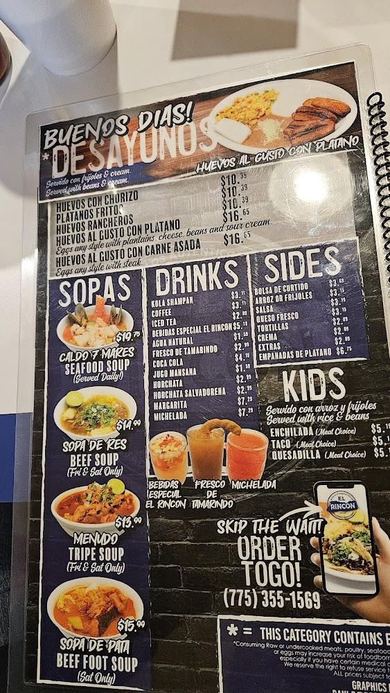Welcome to El Rincon, your go-to Salvadorian restaurant located at 668 Greenbrae Dr, Sparks, NV. Delight in our authentic local specialties, including our famous pupusas, all served in a relaxed and inviting atmosphere perfect for solo diners or groups. We offer a diverse menu for breakfast, brunch, lunch, and dinner, along with delicious cocktails and small sharing plates. Enjoy the convenience of takeout, delivery, and accessible seating for everyone. With a commitment to quality and service, we welcome you to join us for a memorable meal. Reservations are accepted, and we proudly support families with a kid-friendly menu and amenities.